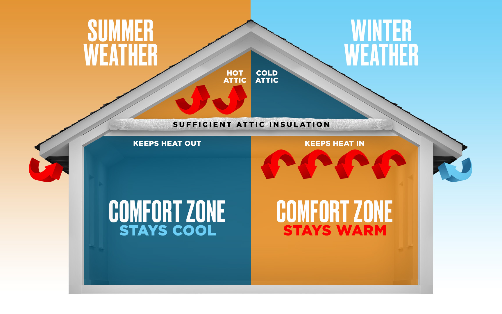 Your attic may be out of sight, out of mind, but it represents the largest barrier to heat loss in your home. A properly insulated attic performs as a blanket to help maintain heat within your home. In the summer months it also helps keep you cool by reducing the heat transfer from the warm outside air.